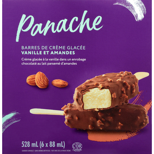 CRÈME GLACÉE : CRÈME # LAIT # SUCRES (SUCRE, SOLIDES DE GLUCOSE, DEXTROSE) #SUBSTANCES LAITIÈRES MODIFIÉES (LAIT) #POUDRE DE LAIT ÉCRÉMÉ # GOMME DE CAROUBE # MONO- ET DIGLYCÉRIDES #ARÔME NATUREL # GOMME DE GUAR #CARRAGHÉNINE # CURCUMA # ROCOU ENROBAGE CHOCOLATÉ AU LAIT AVEC AMANDES : SUCRE # HUILE DE COCO #HUILE DE FÈVE DE SOYA # POUDRE DE LAIT ENTIER # CHOCOLAT NON SUCRÉ # POUDRE DE BABEURRE (LAIT) # BEURRE DE CACAO #AMANDES # LÉCITHINE DE SOYA # ARÔMENATUREL PEUT CONTENIR : OEUF # ARACHIDES #AUTRES NOIX # BLÉ
