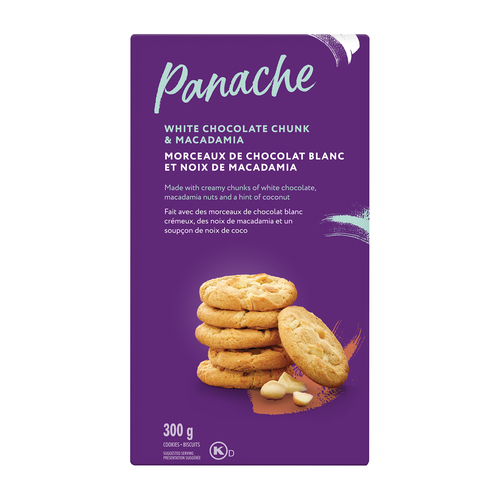 Farine de blé enrichie, beurre, sucres (sucre, cassonade, mélasse qualité fantaisie), morceaux de chocolat blanc (sucre, beurre de cacao, substances laitières [lait], lécithine de soya, extrait de vanille), noix de macadamia, œuf entier liquide, noix de coco, substances laitières modifiées (lait), bicarbonate de sodium, poudre à pâte, arôme naturel, pacanes. PEUT CONTENIR : arachides, autres noix